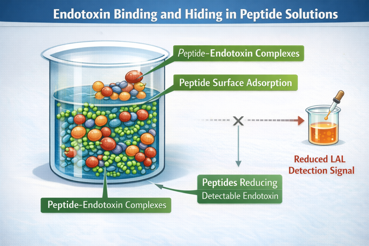 A second risk cluster is molecular binding and adsorption. Cationic peptides/proteins can bind LPS and hinder LAL activation, and physical effects such as endotoxin adsorption to surfaces or high viscosity can also suppress readout. For peptide-rich solutions, this combination means that both peptide–LPS complexation and container interactions are credible contributors to under-recovery when conditions favor binding or surface loss [15].
