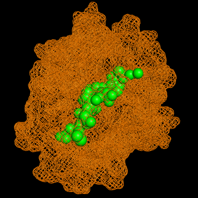 Figure 2: A peptide (green) bound to its protein target (orange surface).