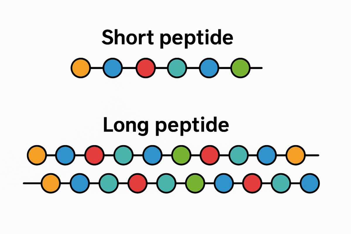 - Peptide length determines how the molecule folds, interacts, and performs biological functions. Shorter peptides often lack defined secondary structures and may act as flexible, rapidly diffusing fragments, while longer peptides can form stable α-helices or β-sheets that enhance receptor binding and biological specificity.
