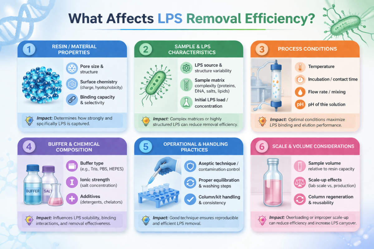 LPS removal efficiency depends on multiple variables, including pH, ionic strength, and the physicochemical properties of both the target molecule and endotoxin [2].Assay conditions also influence measured efficiency. Factors such as surfactants, chelators, and protein–LPS interactions can inhibit detection, leading to underestimation of endotoxin removal performance [4].