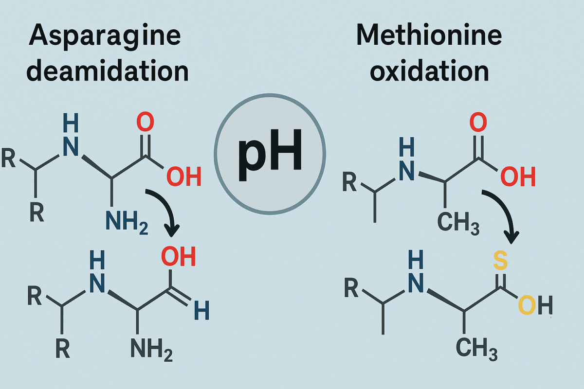 Figure 1: Illustration showing how asparagine deamidation and methionine or cysteine oxidation occur at neutral pH, highlighting key peptide degradation pathways.