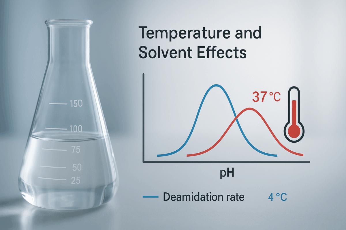 Temperature has a well-known accelerating effect on chemical reactions, and peptide degradation is no exception. Higher temperatures will generally speed up the pH-dependent degradation pathways of peptides [2]. For example, a peptide that slowly deamidates at pH 7 and 4 °C may deamidate much faster at pH 7 and 37 °C. Therefore, what might appear as a stable peptide at room temperature could become unstable at physiological temperature or under heat stress. In practical terms, peptides should be stored at low temperatures (e.g. –20 °C) to slow down degradation kinetics [3]. This is one reason peptide samples are often kept refrigerated or frozen; reduced temperature preserves stability across all pH conditions by damping the reaction rates of hydrolysis, oxidation, and other pathways. Additionally, temperature can influence physical stability – heat can induce peptide unfolding or aggregation, especially near certain pH levels where the peptide is already partially destabilized.