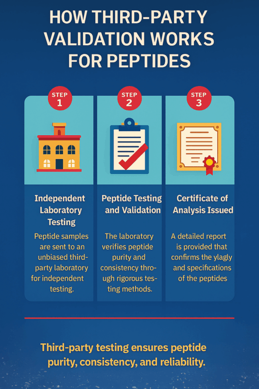 - Third-party validation refers to having an independent, accredited laboratory analyze a peptide sample to confirm its purity, identity, and composition. This typically includes methods such as HPLC, mass spectrometry, microbial testing, and residual solvent analysis. The results are documented in a Certificate of Analysis (COA) that objectively verifies the peptide meets specification.