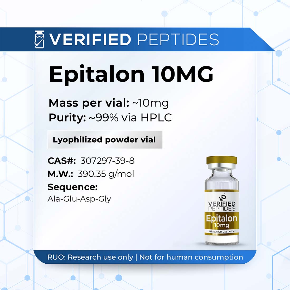 Epitalon (AEDG) is a synthetic tetrapeptide composed of alanine, glutamic acid, aspartic acid, and glycine. It was developed through fractionation and characterization of the pineal extract Epithalamin and has been investigated across in vitro, in vivo, and in silico experimental systems. Within epitalon peptide research, AEDG is positioned as a highly bioactive regulatory peptide with effects spanning neuroendocrine, immune, and aging-related processes. Preclinical research has reported geroprotective, antioxidant, neuro-endocrine, and antimutagenic activities in multiple animal and cellular models, with proposed mechanisms including modulation of telomerase activity, preservation of telomere length, and possible epigenetic interactions with DNA and chromatin-associated proteins.
