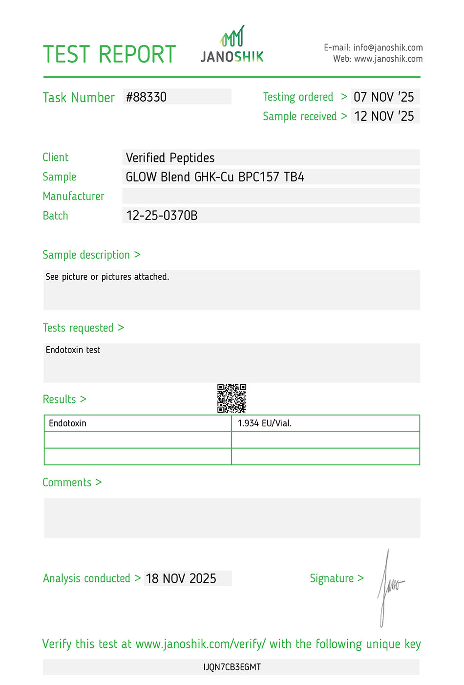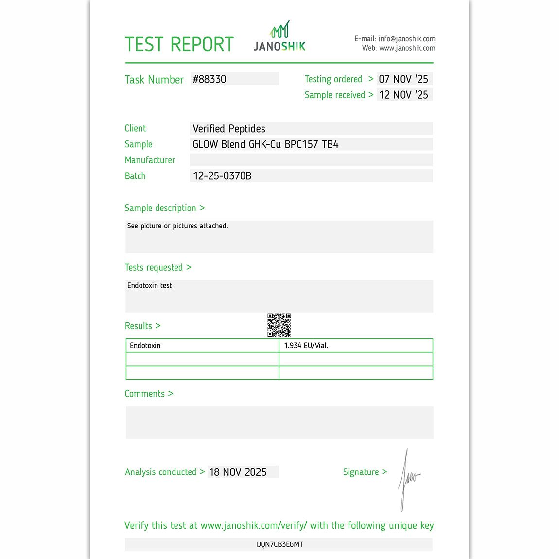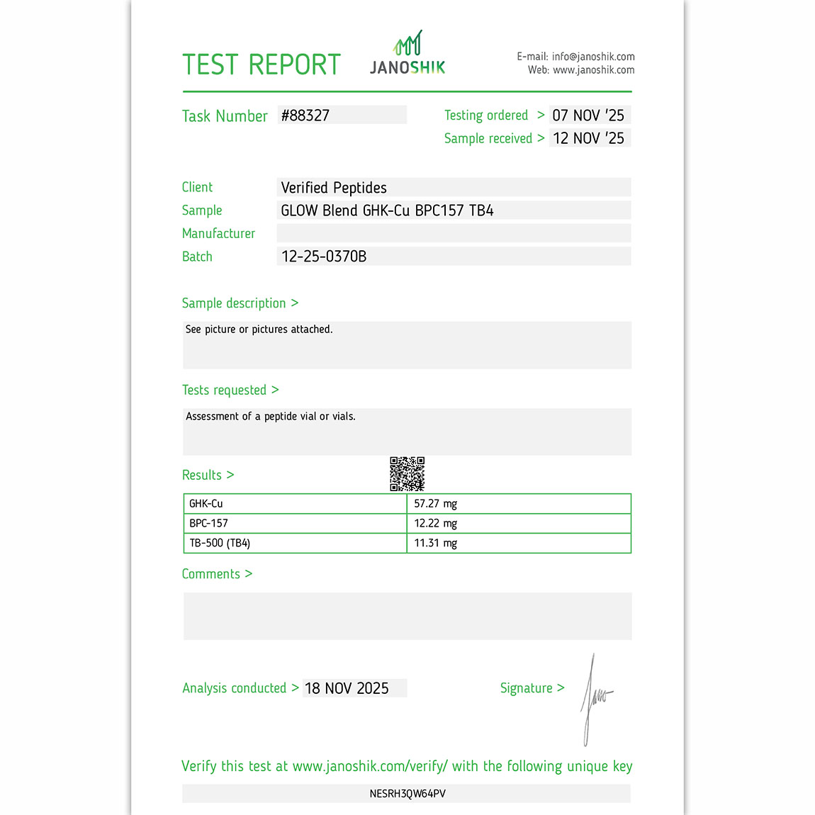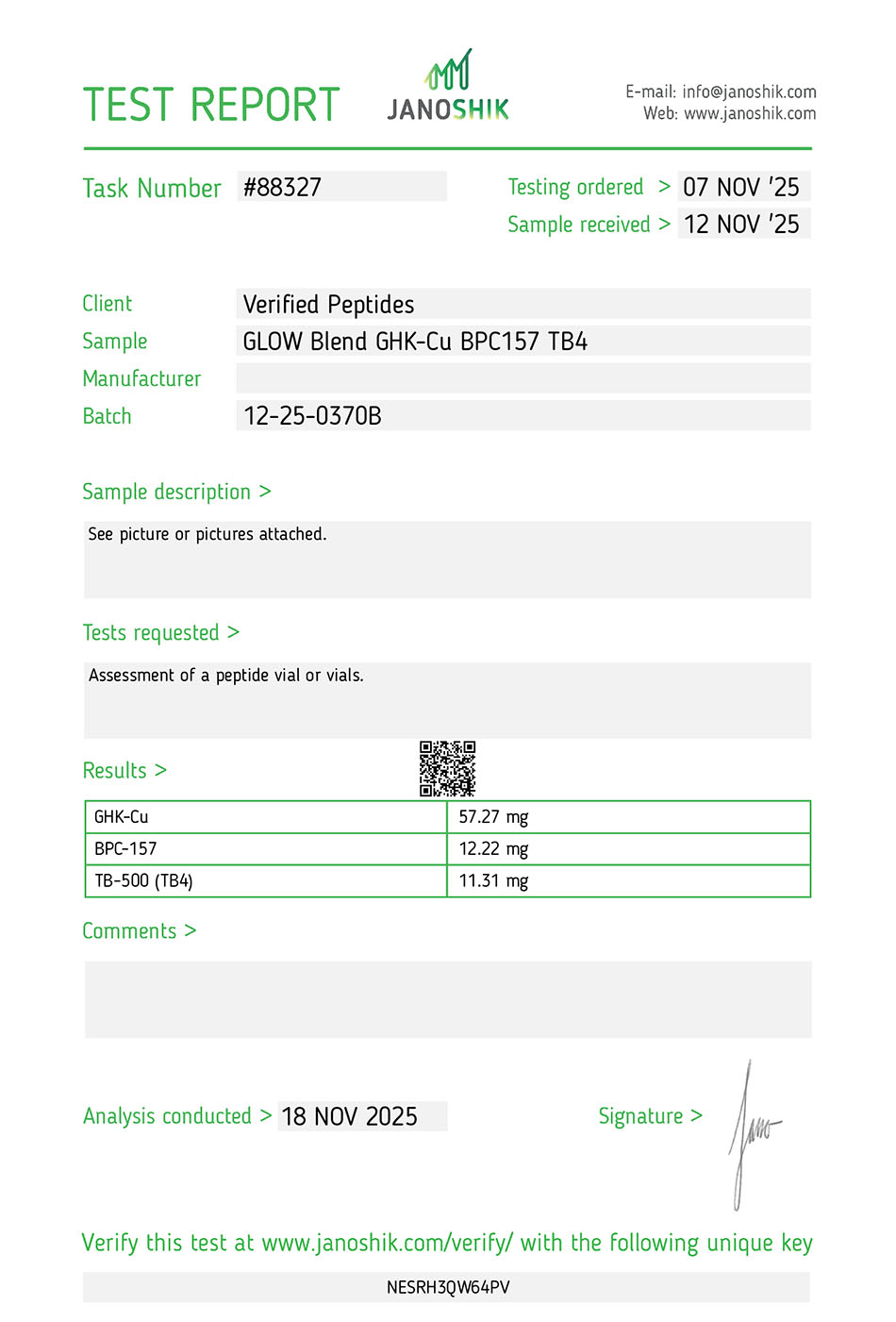 This batch of GHK BPC-157 TB-500 Blend has been third party lab tested and verified for quality.