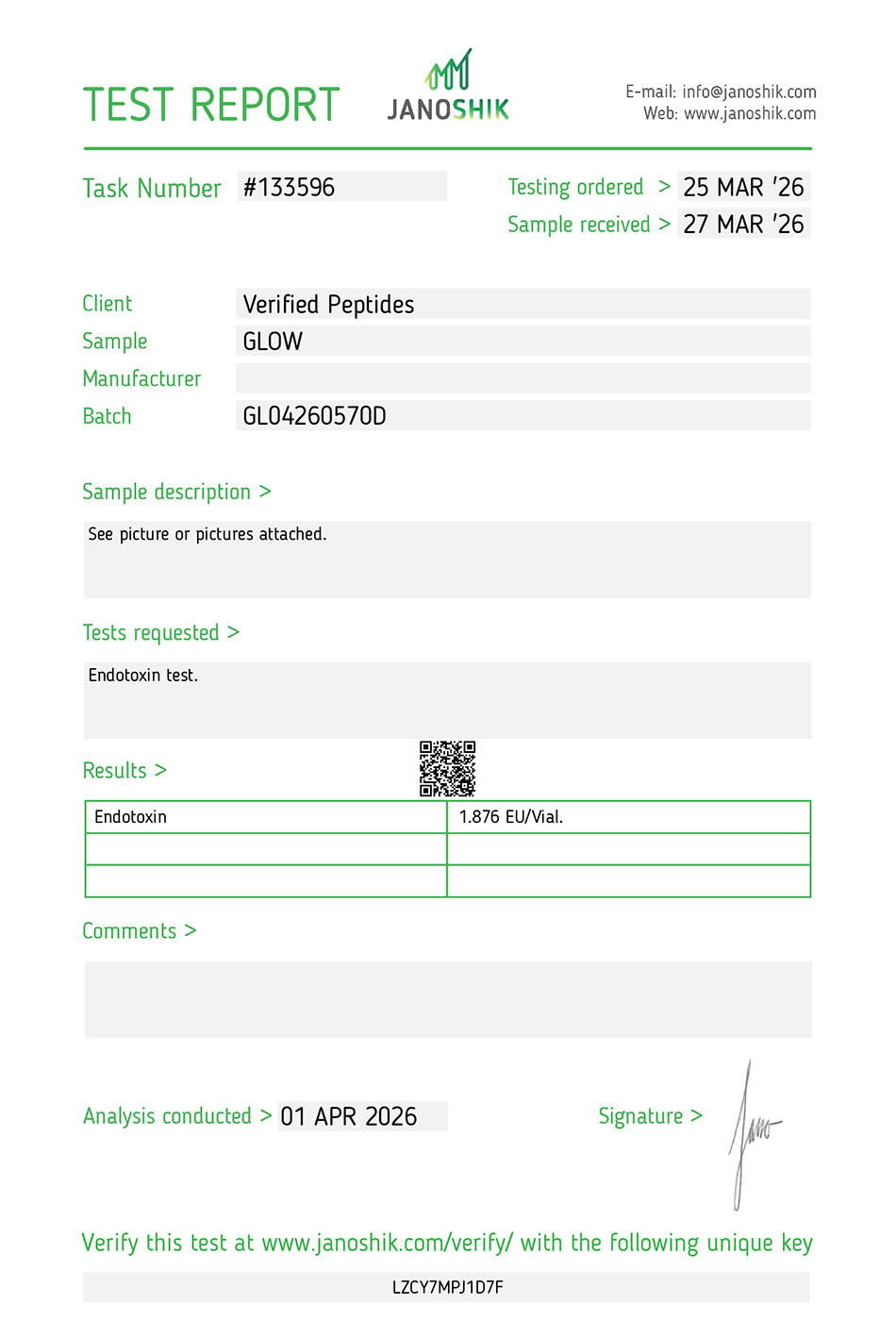 We conduct an array of tests via HPLC and other methods for our peptides: purity, weight, endotoxins(LPS), sterility (bacteria & mold/yeast), and TFA content.