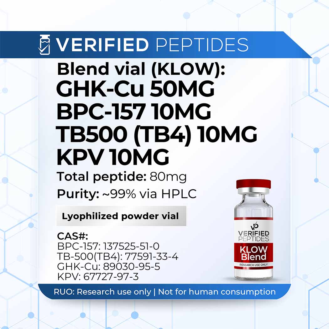 This batch of KPV GHK BPC-157 TB-500 KLOW Blend has been third party lab tested and verified for quality.