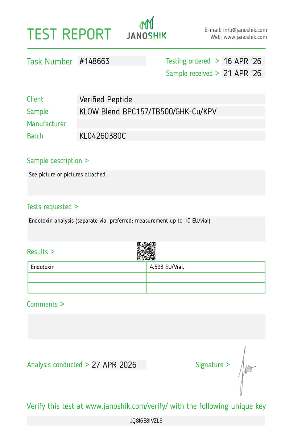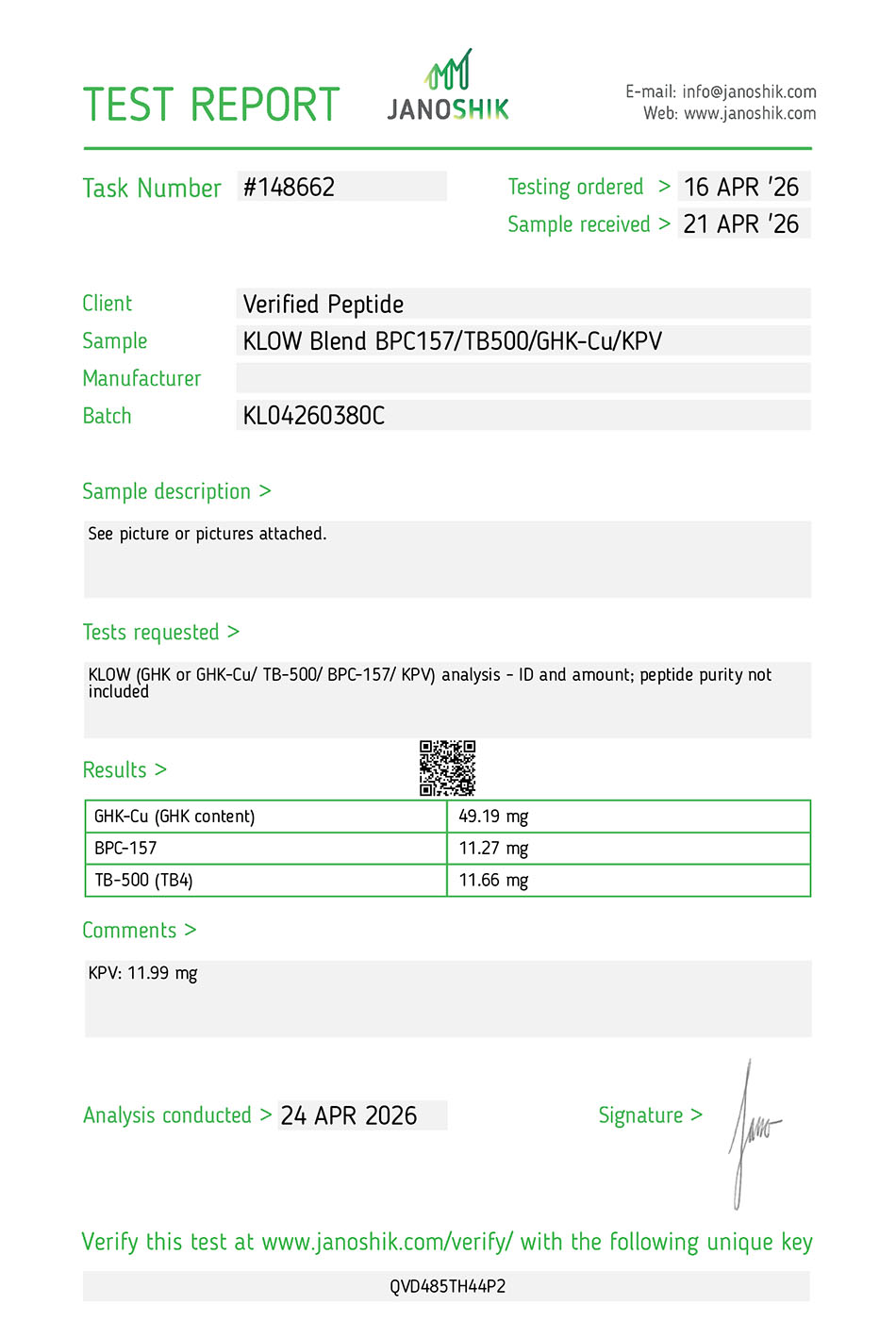 This batch of KPV GHK BPC-157 TB-500 KLOW Blend has been third party lab tested and verified for quality.