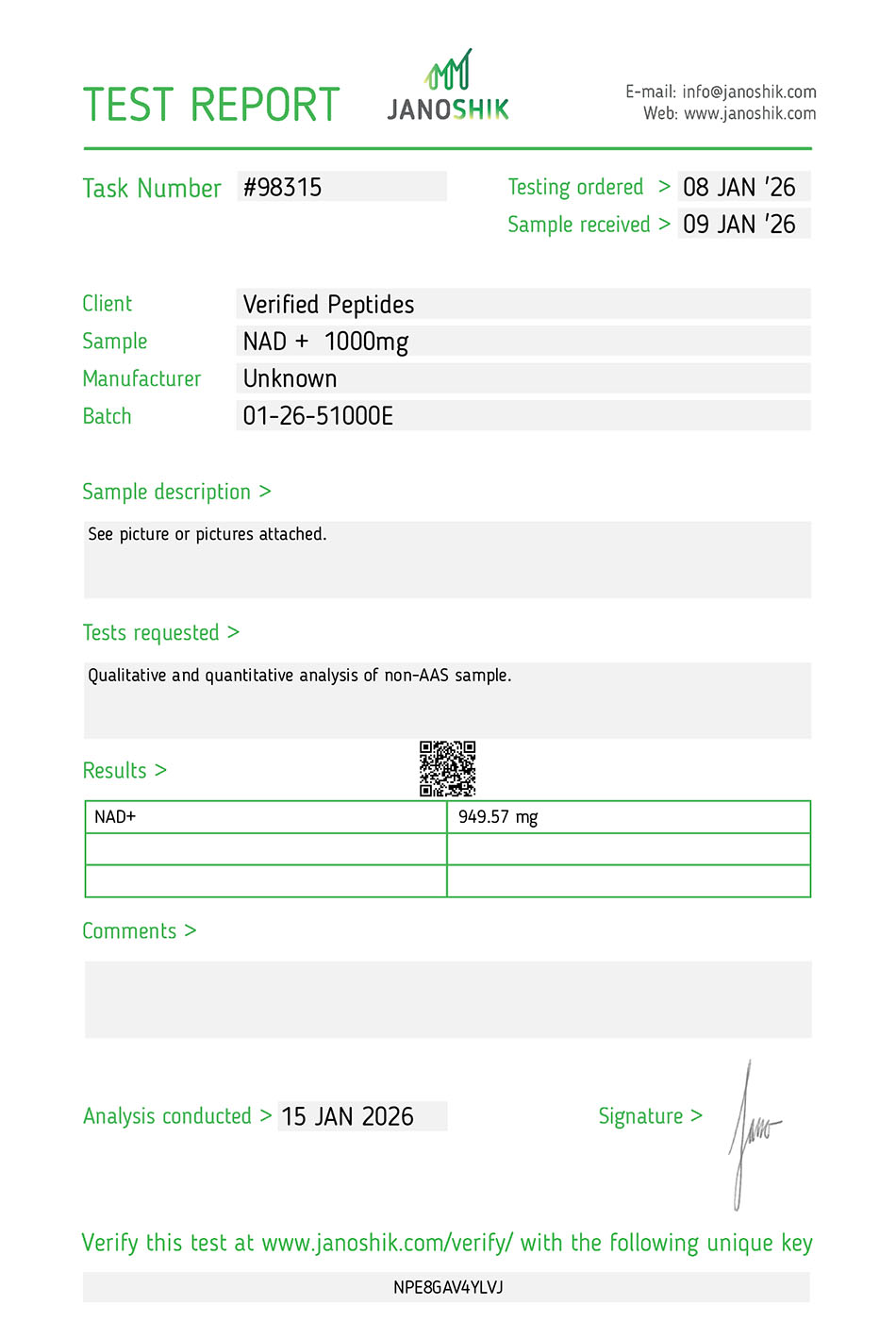 Nicotinamide Adenine Dinucleotide (NAD+) is an essential redox coenzyme that supports mitochondrial energy metabolism, DNA repair, and cellular resilience. NAD+ levels progressively decline with age, impairing mitochondrial oxidative capacity and contributing to metabolic disorders, inflammation, and reduced physiological performance. NAD+ precursors such as nicotinamide mononucleotide (NMN) and nicotinamide riboside (NR) have emerged as promising interventions capable of restoring intracellular NAD+ pools and reversing age-related metabolic dysfunction.