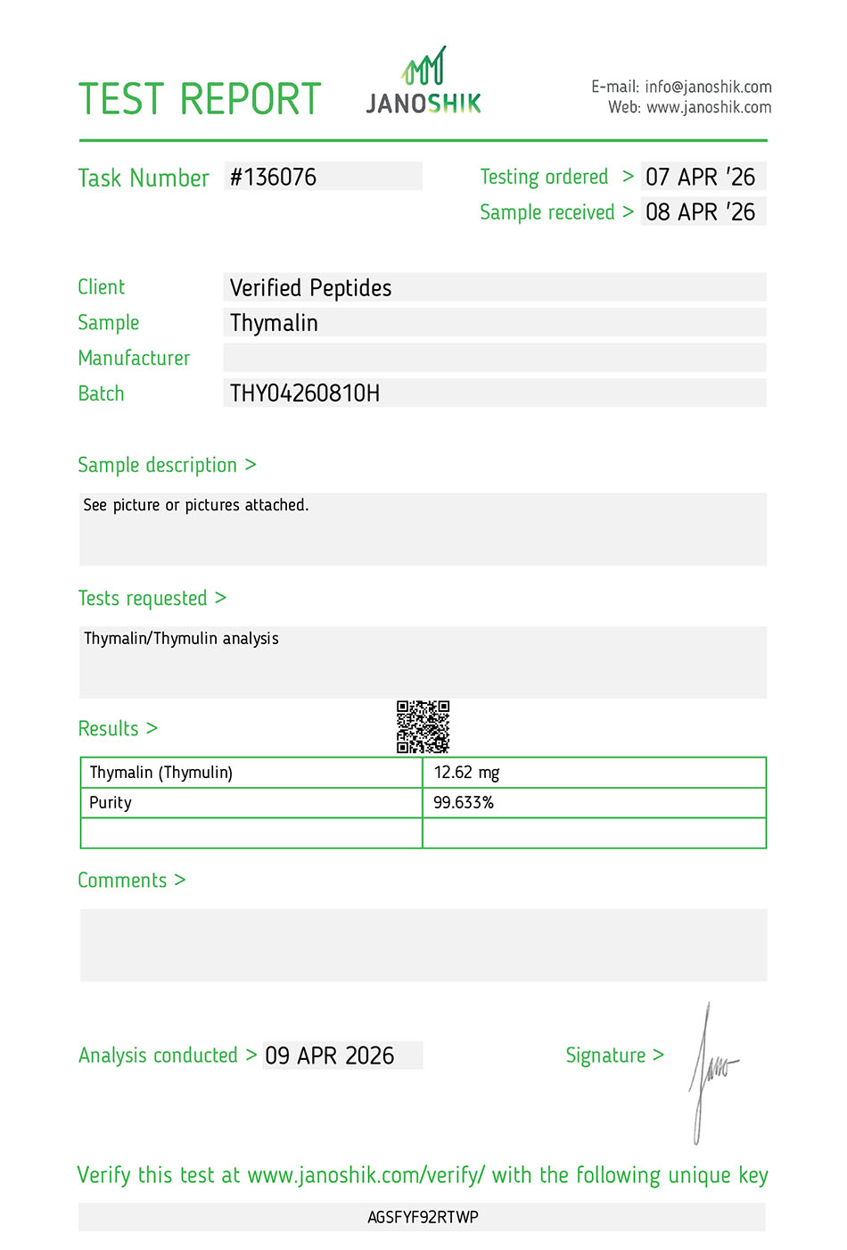 This batch of Thymalin has been third party lab tested and verified for quality.